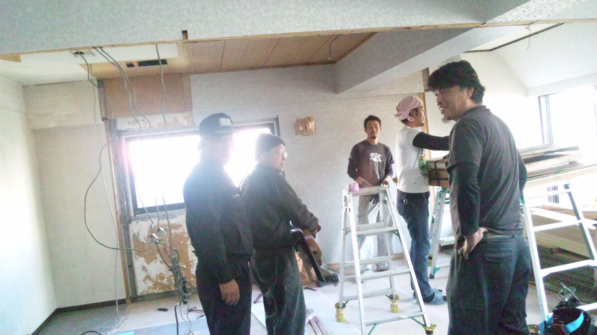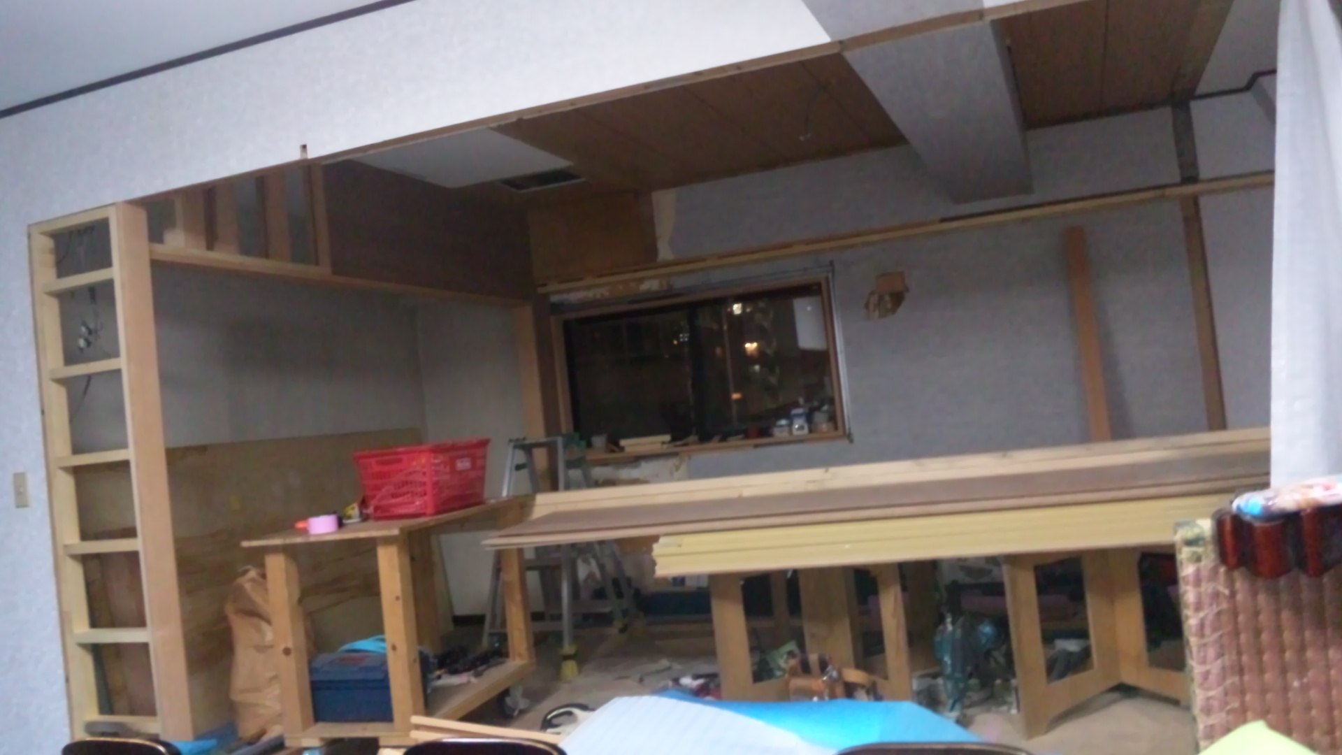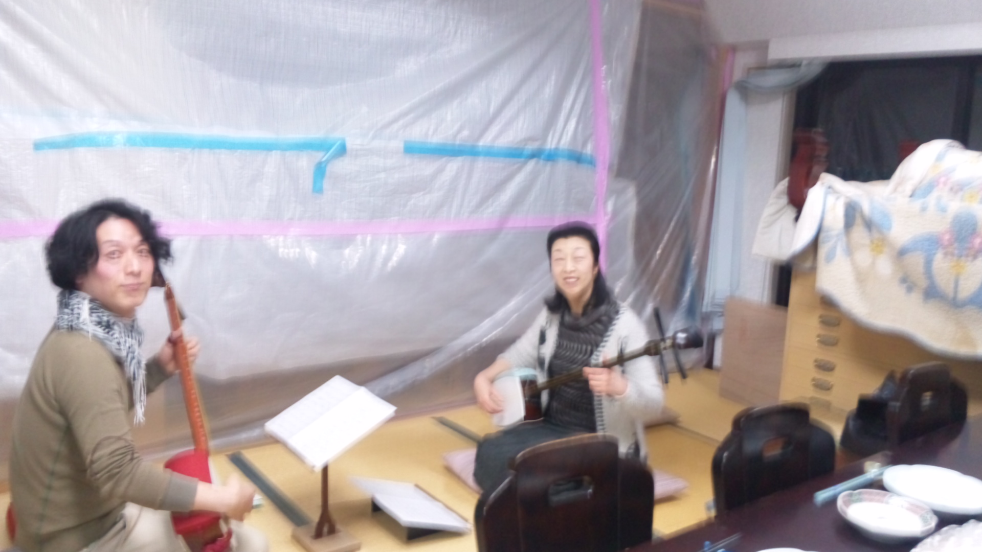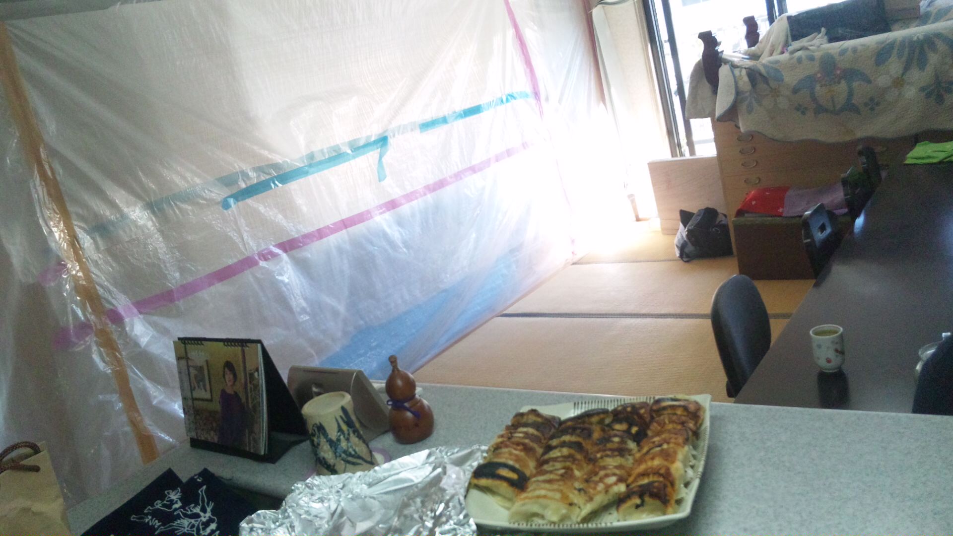 養生シートのある空間の一部に畳を敷いての生活はまるで芝居小屋の楽屋のようにも思えてそれはそれでなかなかに面白いものです。