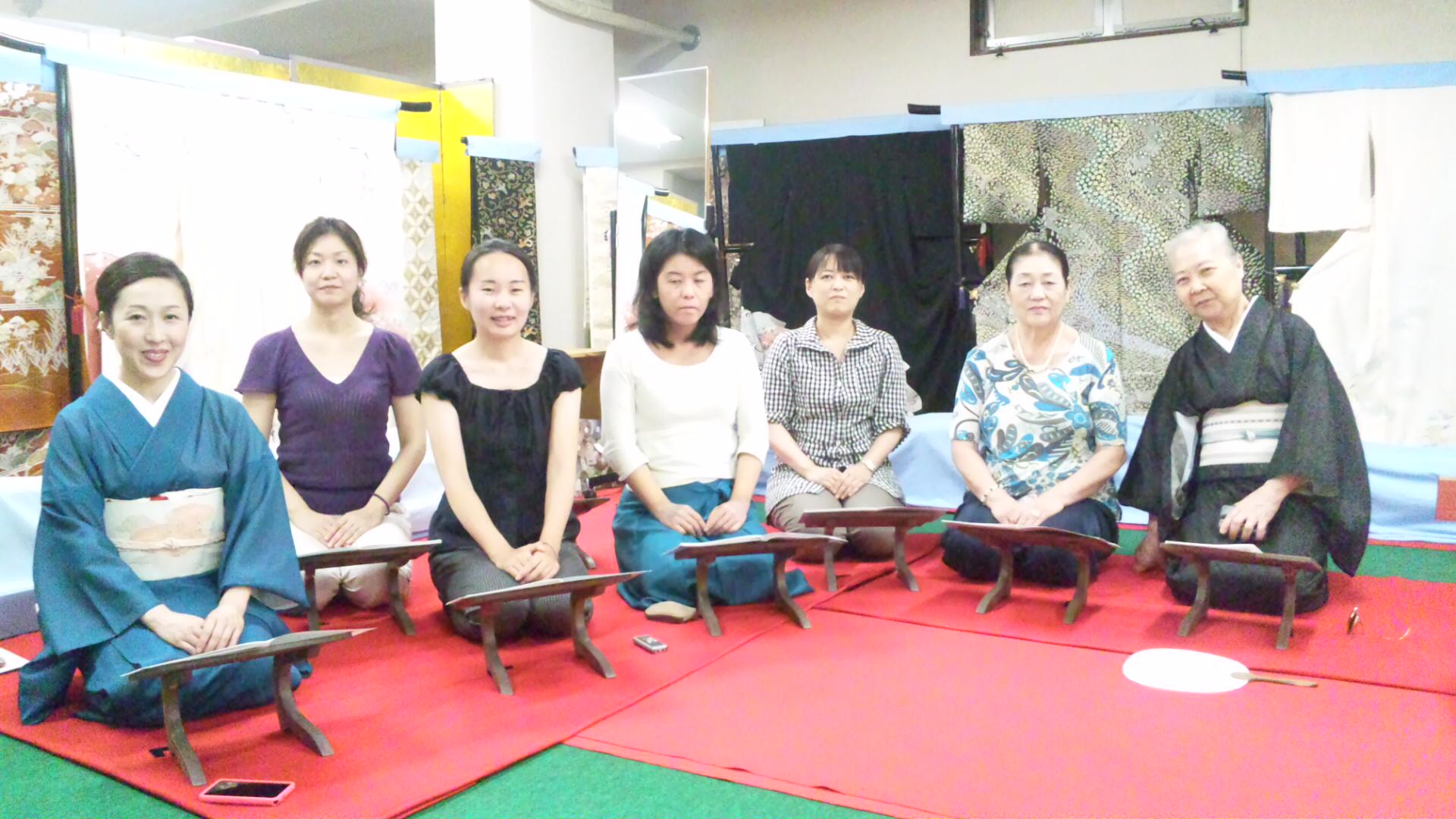 日本橋教室に寄って汗だくの着物を脱ぎ軽装になった芝鳳会の皆さんをうらやましく眺める依然着物姿の佐さんと麗さんと翠さんと私。