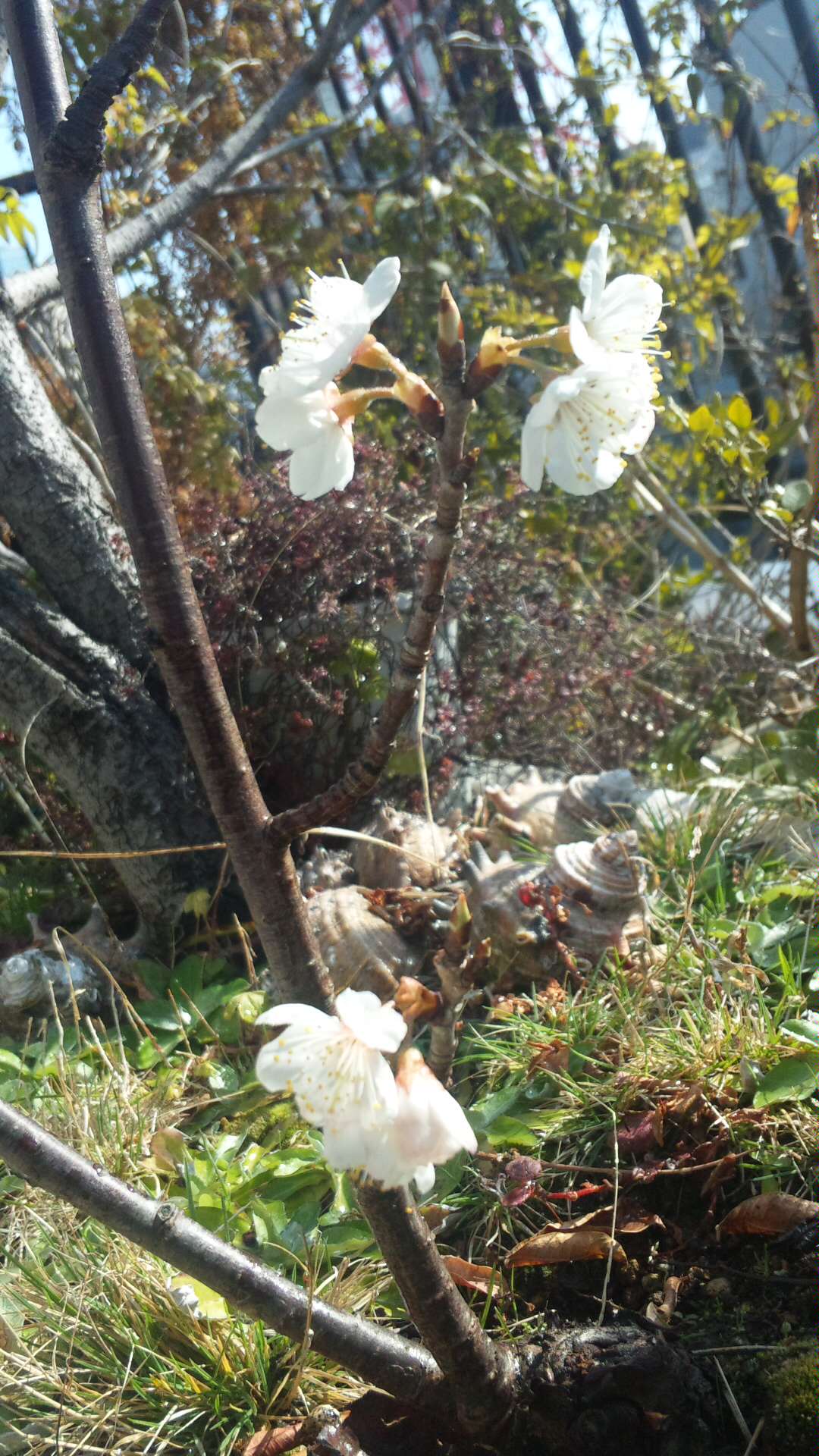 ベランダの小さな桜の木の下の方に桜が咲きました。