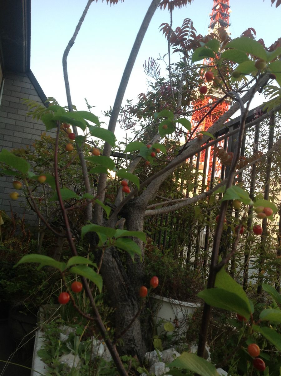 ベランダの小さなさくらんぼが色づいてきました。
