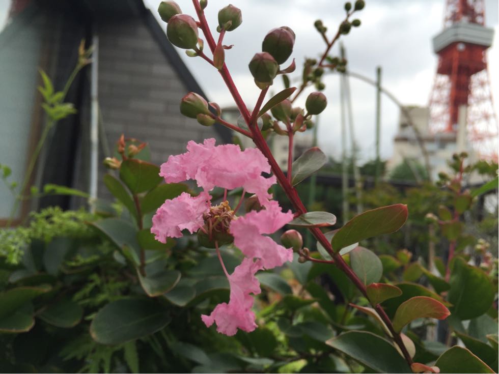 心地よい汗をかいて部屋に戻ってきましたら曇り空ながらベランダでは父の形見の百日紅が一輪咲いていました。